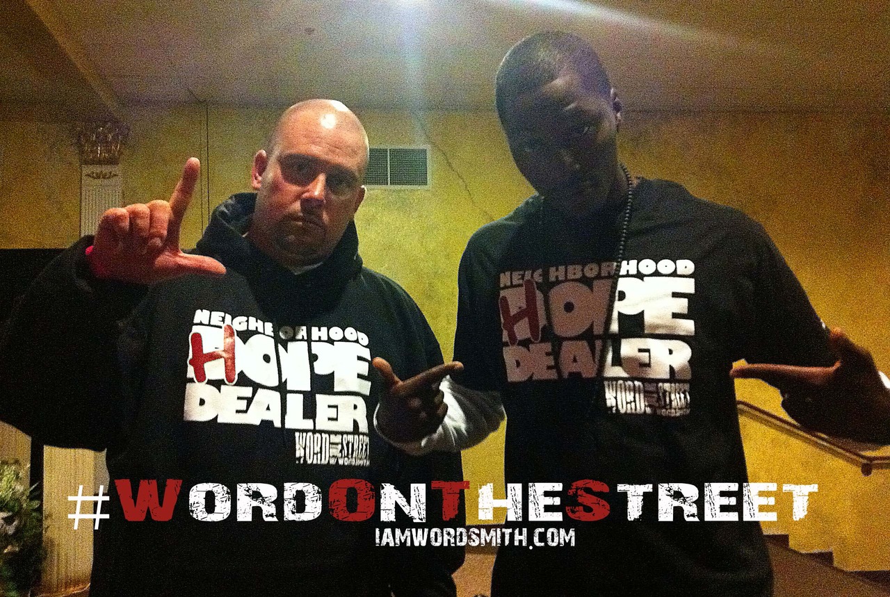 Wordsmith & Transparent gettin it in at the official launch of our #WordOnTheStreet w/Wordsmith “Neighborhood Hope Dealer” shirts … God be praised! This is the first of a series that will be released under #WordOnTheStreet … Stay Tuned! #OccupyAllStreets iamwordsmith.com